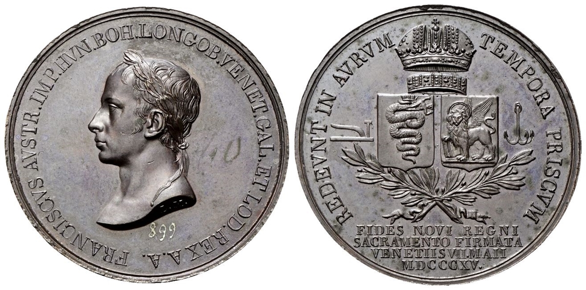 Dr. FRANCISCVS AVSTR IMP HVN BOH LONGOB VENET GAL ET LOD REX A A. Testa laureata a s.; sotto la troncatura del collo, VASSALLO F. Rv. REDEVNT IN AVRVM - TEMPORA PRISCVM. Stemma di Milano e Venezia sormontato da corona ferrea e corona imperiale; ai lati, aratro e ancora, tutto su due rami di quercia incrociati e legati alla base; esergo, FIDES NOVI REGNI / SACRAMENTO FIRMATA / VENETI