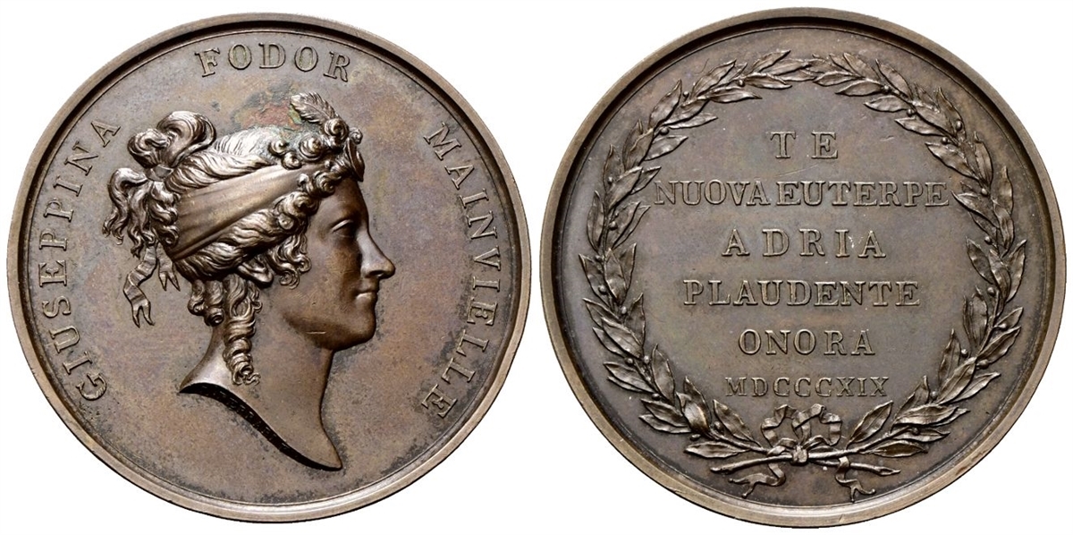 Dr. GIUSEPPINA FODOR MAINVIELLE. Testa a d., con capelli raccolti. Rv. TE / NUOVA EUTERPE / ADRIA / PLAUDENTE / ONORA / MDCCCXIX. Iscrizione disposta su sei righe, entro corona di alloro.