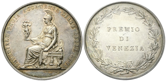 Dr. IMPERIALE REGIA ACCADEMIA DELLE BELLE ARTI. Atene seduta verso s. regge con la mano s. le Tre Grazie; in esergo, L MANFREDINI F. Rv. PREMIO / DI / VENEZIA. Iscrizione disposta su tre righe tra rami di lauro.