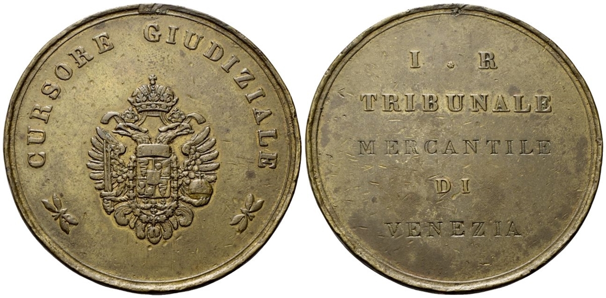 Dr. CURSORE GIUDIZIALE. Aquila bicipite coronata con il petto caricato dello stemma del Regno Lombardo-Veneto sormontato dalla corona ferrea. Rv. I R / TRIBUNALE / CIVILE DI VENEZIA.