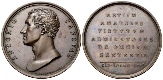 Dr. ANTONIO - CANOVA. Testa a s.; sotto il taglio del collo, G. GIROMETTI F. Rv. ARTIVM / AMATORE / VIRTVTVM / ADMIRATORES / DE OMNIVM / SENTENTIA. Iscrizione disposta su sei righe.