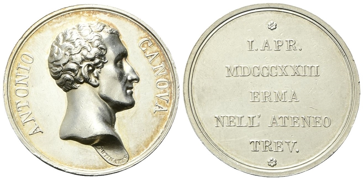 Dr. ANTONIO - CANOVA. Testa a d.; sotto il taglio del collo, PUTINATI F. Rv. I APR / MDCCCXXIII / ERMA / NELL’ATENEO TREV. Iscrizione disposta su cinque righe.