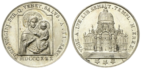 Dr. DEIP VIRGINI PER Q VENET SALVS A II SAEC. La Vergine con il Figlio; sotto, MDCCCXXX. Rv. VRBE A LVE LIB SENA - T TEMPL H EREX.Veduta prospettica della chiesa della Salute.
