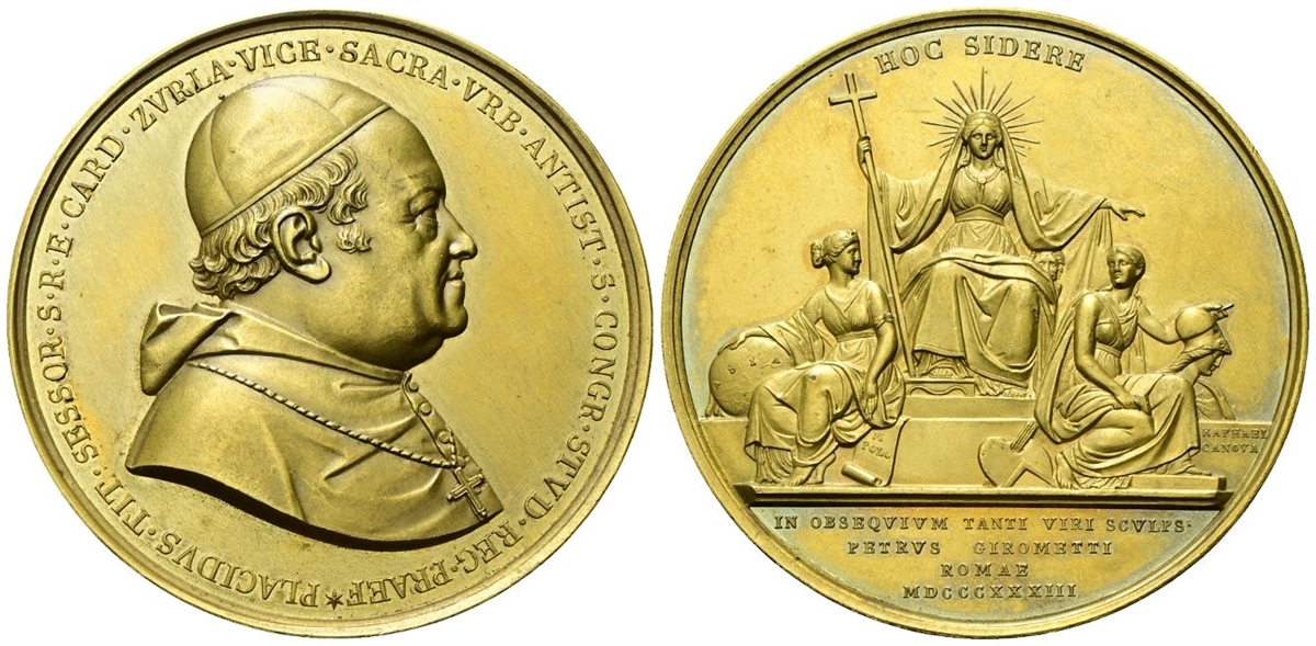 Dr. PLACIDVS TIT SESSOR S R E CARD ZVRLA VICE SACRA VRB ANTIST S CONGR STVD REG PRAEF. Busto a d., con abito talare e con croce pettorale. Rv. HOC SIDERE. La Religione in trono frontale, raggiante, regge croce; ai lati, le figure allegoriche dell'Arte e della Scienza; in esergo, IN OBSEQVIVM TANTI SCVLPS / PETRVS GIROMETTI / ROMAE / MDCCCXXXIII.