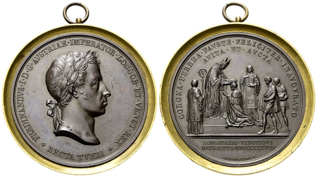 Dr. FERDINANDVS I D G AVSTRIAE IMPERATOR LONGOB ET VENET REX. Testa laureata a d.; sulla troncatura del collo, I MANFREDINI F; sotto, RECTA TVERI. Rv. CORONA FERREA FAVSTE FELICITER INAVGVRATO. L’Arcivescovo di Milano pone la corona ferrea sopra la testa di Ferdinando I; in esergo, LONGOBARDI VENETIQVE / MENS SEPT A MDCCCXXXVIII / L MANFREDINI F.