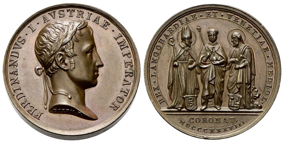 Dr. FERDINANDVS I AVSTRIAE IMPERATOR. Testa laureata a d.; sulla troncatura del collo, I D BOEHM F. Rv. REX LANGOBARDIAE ET VENETIAE MEDIOL. L’imperatore stante fra Sant’Ambrogio e San Marco; in esergo, CORONAT / MDCCCXXXVIII.