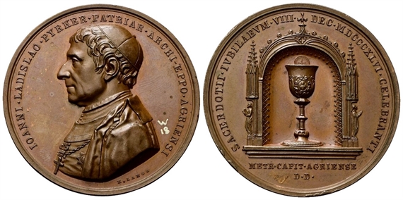 Dr. IOANNI LADISLAO PYRKER PATRIAR ARCHI EPPO AGRIENSI. Busto a d., con abito talare e croce pettorale; sotto, K LANGE. Rv. SACERDOTII IVBILAEVM VIII - DEC MDCCCXLVI CELEBRANTI. Calice con Eucerestia entro tabernacolo; in esergo, METR CAPIT AGRIENSE / D D.