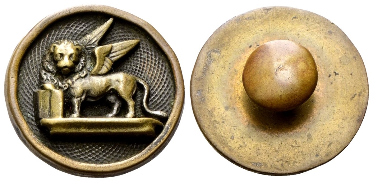 Dr. Leone di San Marco andante verso s., con libro aperto, poggiante su di un piedistallo, entro una cornice circolare, su sfondo zigrinato. Rv. Piedino portativo da infilare in un’asola della giacca.
