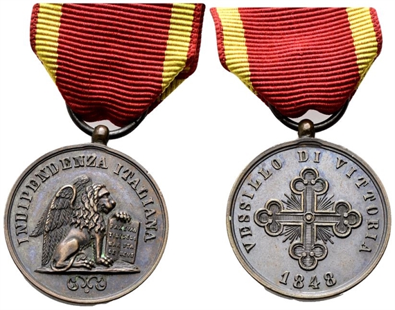Dr. INDIPENDENZA - ITALIANA. Leone di S. Marco verso d., con ali sovrapposte; in esergo, ornato composto da due elementi ricurvi simmetrici. Rv. VESSILLO DI VITTORIA 1848. Una croce raggiante trifogliata.