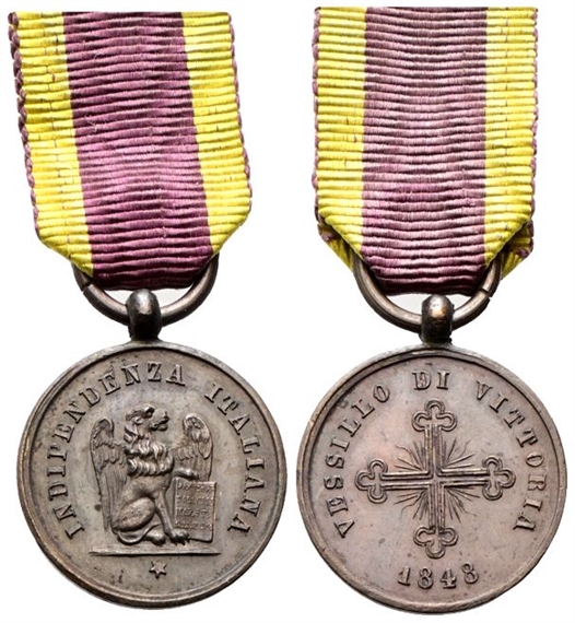 Dr. INDIPENDENZA - ITALIANA. Leone di S. Marco verso d., con ali separate; in esergo, stella. Rv. VESSILLO DI VITTORIA 1848. Una croce raggiante trifogliata.
