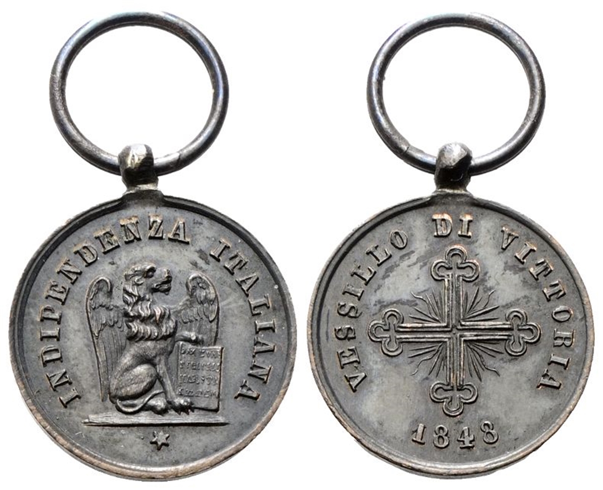 Dr. INDIPENDENZA - ITALIANA. Leone di S. Marco verso d., con ali separate; in esergo, stella. Rv. VESSILLO DI VITTORIA 1848. Una croce raggiante trifogliata.