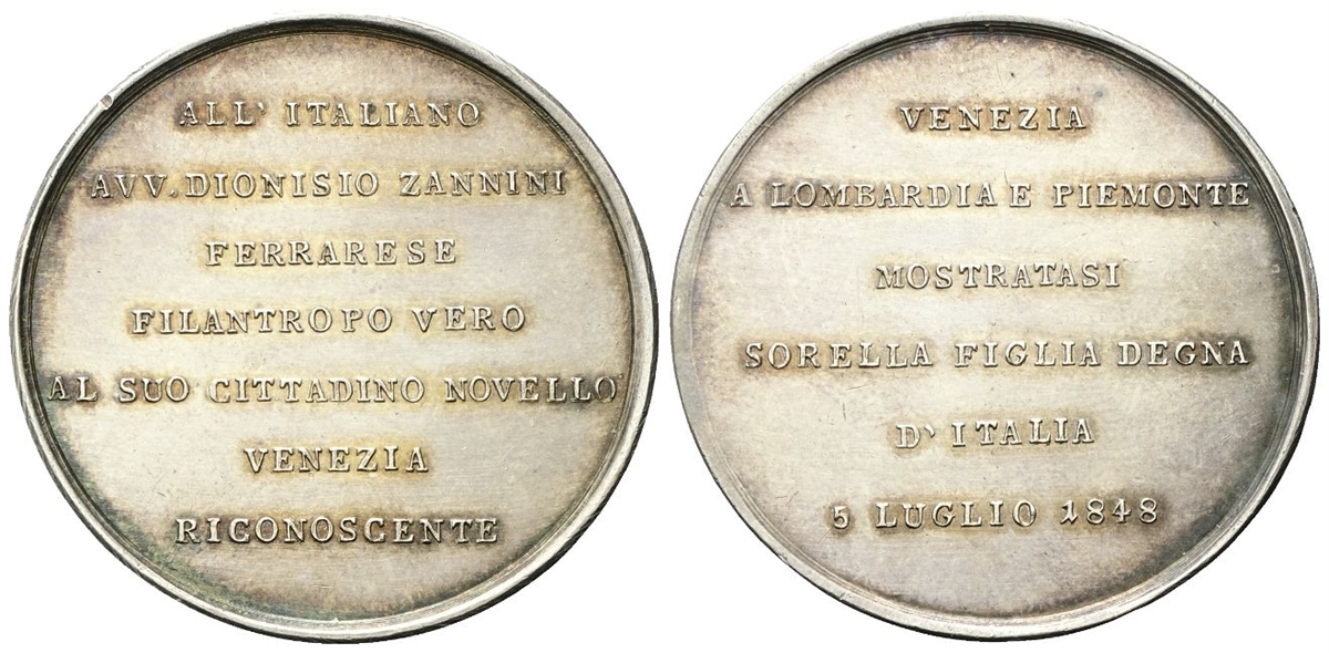 Dr. ALL’ITALIANO / AVV. DIONISIO ZANNINI / FERRARESE / FILANTROPO VERO / AL SUO CITTADINO NOVELLO / VENEZIA / RICONOSCENTE. Rv. VENEZIA / A LOMBARDIA E PIEMONTE / MOSTRATASI / SORELLA FIGLIA DEGNA / D’ITALIA / 5 LUGLIO 1848.