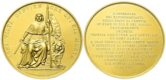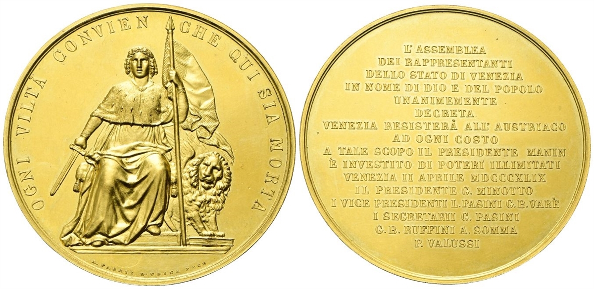 Dr. OGNI VILTA’ CONVIEN - CHE QUI SIA MORTA. La Repubblica di Venezia, seduta di fronte con vessillo e spada, ha accanto un leone; sotto, A FABRIS D’UDINE FECE. Rv. L’ASSEMBLEA / DEI RAPPRESENTANTI / DELLO STATO DI VENEZIA / IN NOME DI DIO E DEL POPOLO / UNANIMANENTE / DECRETA / VENEZIA RESISTERà ALL’AUSTRIACO / AD OGNI COSTO / A TALE SCOPO IL PRESIDENTE MANIN / E’INVESTITO DI POTERI ILLIMITATI / VENEZIA II APRIL