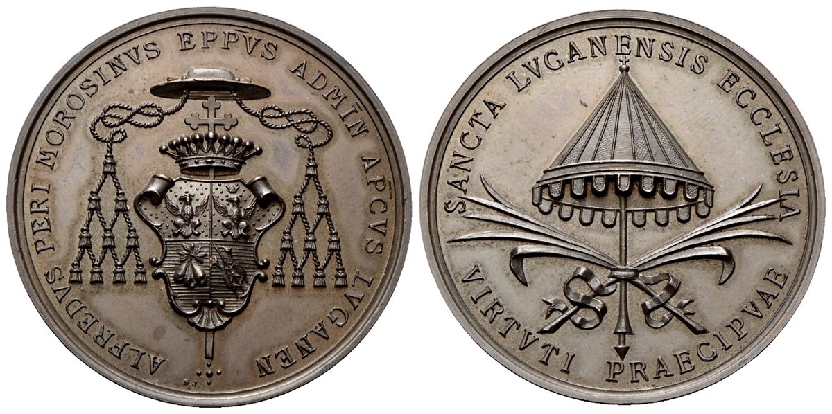 Dr. ALFREDVS PER MOROSINVS EPPVS ADMIN APCVS LVGANEN. Stemma sormontato da cappello cardinalizio. Rv. SANCTA LVGANENSIS ECCLESIA / VIRTVTI PRAECIPVAE. Padiglione sovrapposto a due rami di palma decussati.