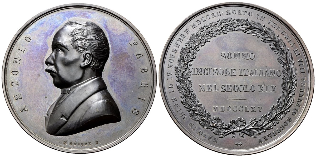 Dr. ANTONIO - FABRIS. Busto a d.; sotto, F STIORE F. Rv. NATO IN UDINE IL IV NOVEMBRE MDCCXC MORTO IN VENEZIA LI VIII FEBBRAIO MDCCCLXV. SOMMO / INCISORE ITALIANO / NEL SECOLO XIX / MDCCCLXV. Iscrizione disposta su quattro righe.