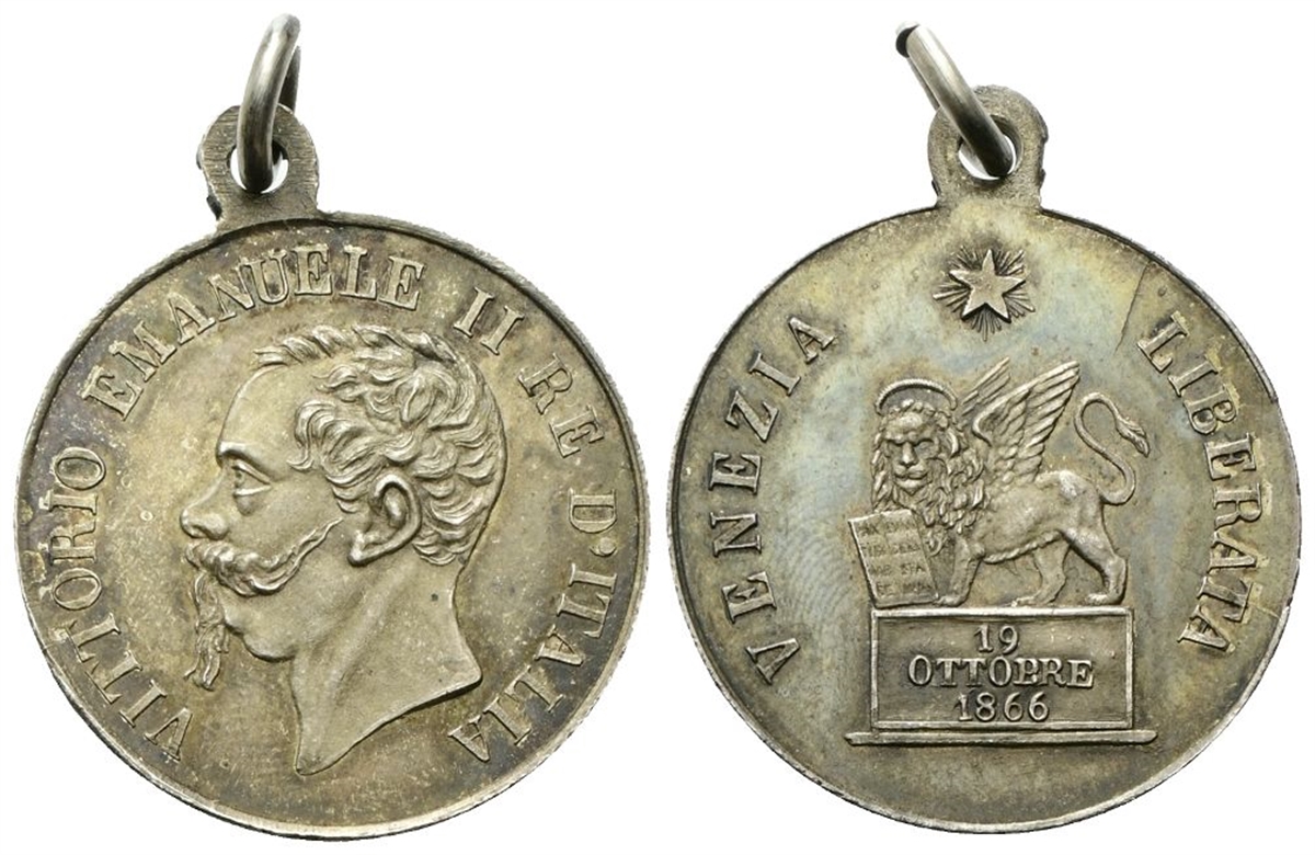 Dr. VITTORIO EMANUELE II RE D’ITALIA. Testa nuda a s. Rv. VENEZIA RESTITUITA ALL’ITALIA. Leone di San Marco; sul piedistallo, 19 / OTTOBRE / 1866.