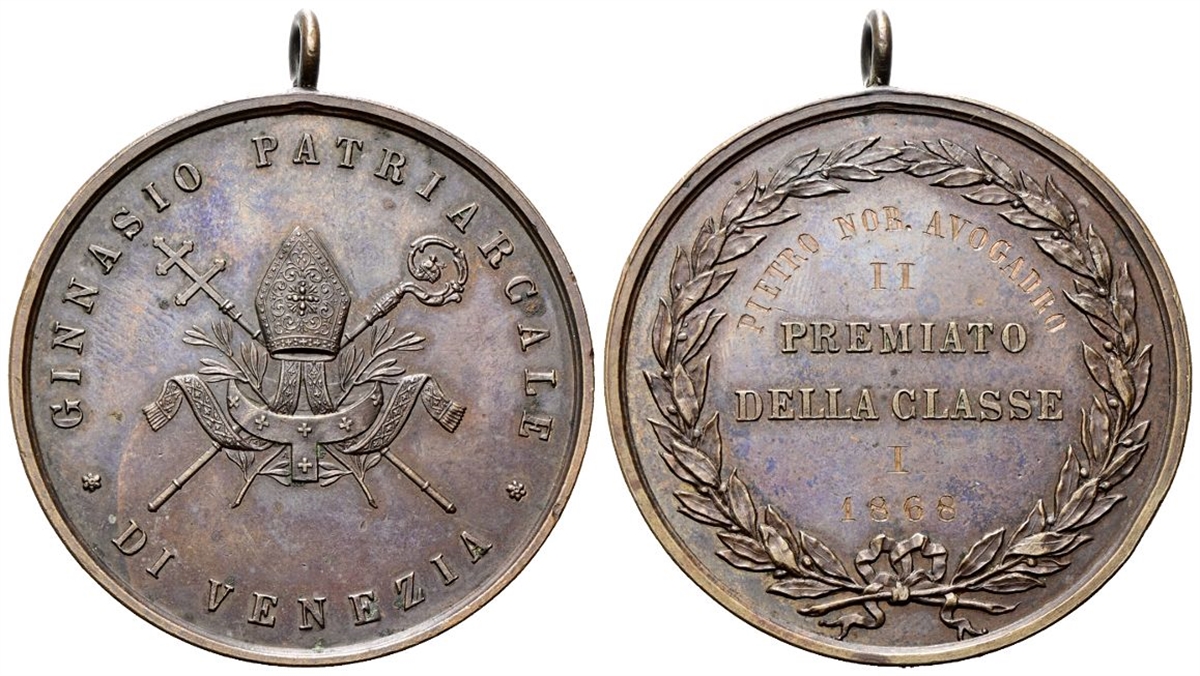 Dr. GINNASIO PATRIARCALE / DI VENEZIA. Stemma patriarcale di Venezia. Rv. PIETRO NOB AVOGADRO / II / PREMIATO / DELLA CLASSE / I / 1868.