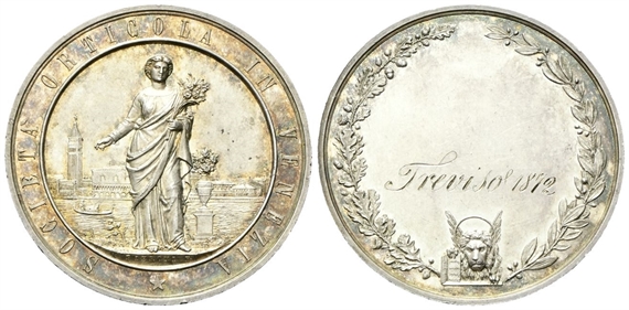 Dr. SOCIETA’ ORTICOLA IN VENEZIA. Venezia, stante e frontale, reca nella mano d. una corona di alloro e nella s. dei fiori; dietro di lei, il Bacino di San Marco solcato da una gondola; sullo sfondo, l’edificio della Zecca, il Campanile di San Marco, Pala Rv. TREVISO 1872. Corona formata da due rami di alloro legati tra loro in basso da un leone di San Marco in maestà.