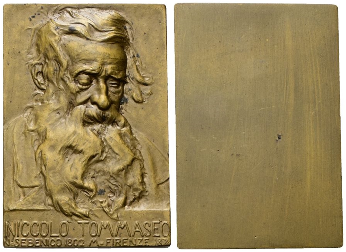 Dr. Busto di N. Tommaseo di scorcio verso d.; sotto, NICCOLÒ TOMMASEO / N. SEBENICO 1802 M. FIRENZE 1874. Rv. -