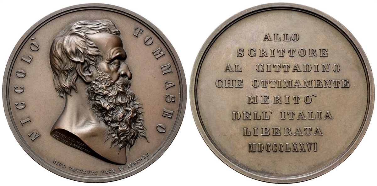 Dr. NICCOLò - TOMMASEO. Busto a d.; nel taglio del busto, LEVATO DA BUSTO / DEL PROF U LUCCHESI; sotto, GIOV. VAGNETTI FECE IN FIRENZE Rv. ALLO / SCRITTORE / AL CITTADINO / CHE OTTIMAMENTE /