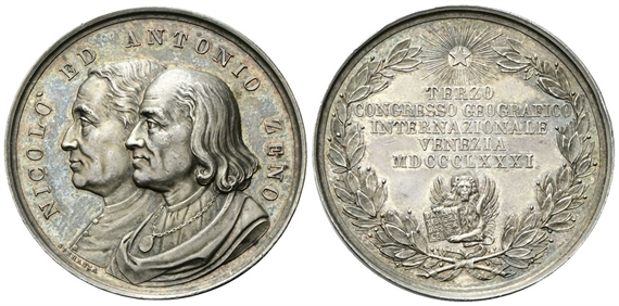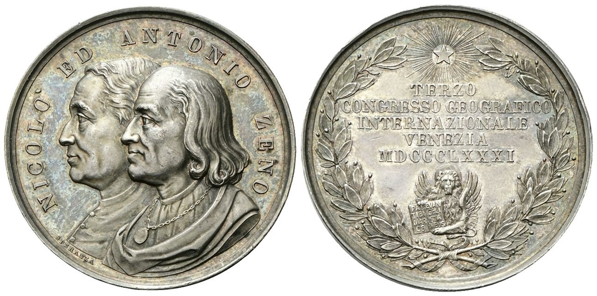 Dr. NICOLO’ ED ANTONIO ZENO. Busti accollati, riccamente vestiti, a s.; sotto, SPERANZA. Rv. TERZO / CONGRESSO GEOGRAFICO / INTERNAZIONALE / VENEZIA /MDCCCLXXXI. Iscrizione disposta su cinque righe; sopra, stella raggiante; sotto, il leone di San Marco, tutto entro rami di lauro legati in basso.