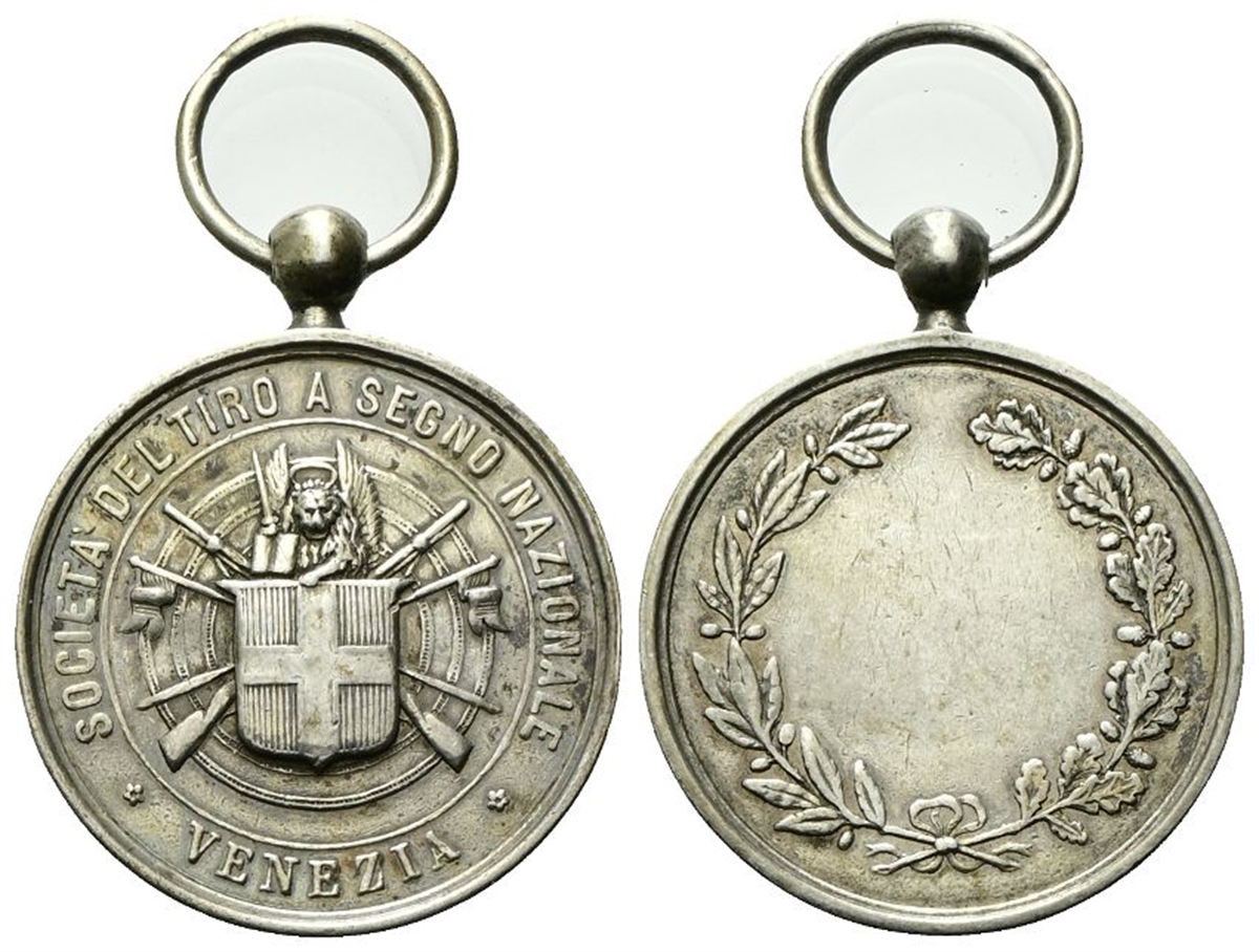 Dr. SOCIETà TIRO A SEGNO NAZIONALE / VENEZIA. Stemma Savoia sormontato da leone di San Marco in maestà, reggente il libro e la spada; il tutto sovrapposto a due fucili e due bandierine di segnalazione incrociati e; sullo sfondo, un bersaglio circolare. Rv. Due rami di alloro e di quercia legati tra loro in basso da un nastro.