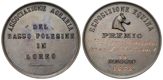 Dr. ASSOCIAZIONE AGRARIA. DEL / BASSO POLESINE / IN / LOREO. Rv. ESPOSIZIONE EQUINA. Testa di cavallo / PREMIO / AI FLLI CONTI PAPADOPOLI (inciso) / PER UN PULEDRO DI ANNI 4 (inciso) / 10 (inciso) / MAGGIO / 1888 (inciso).