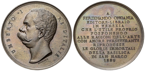 Dr. UMBERTO I - RE D’ITALIA. Testa a s.; sotto, SPERANZA. Rv. A / FERDINANDO ONGANIA / EDITORE LIBRAIO / IN VENEZIA / CHE L’UTILE PROPRIO / POSPONENDO / ALLE RAGIONI DELL’ARTE / CON AMORE PERSEVERANTE / RIPRODUSSE / LE GLORIE IMMORTALI / DELLA BASILICA / DI SAN MARCO / 1889. Iscrizione disposta su tredici righe.