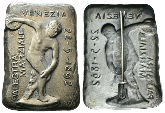 Dr. PALESTRA / MARZIALE; sopra: VENEZIA. Atleta nudo nell’atto di lanciare il disco; a d., 22 - 5 - 1892; sotto, SANTI. Rv. Impronta negativa del dritto e spilla portativa