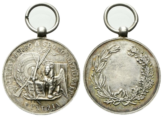 Dr. SOCIETà TIRO A SEGNO NAZIONALE / VENEZIA. Leone di San Marco in maestà, reggente il libro aperto sulla scritta PAX / TIBI / MAR / CE - EVAN / GELI / STA / MEVS e la spada; dietro, un fucile, dei rami di alloro e, affiancati, un bersaglio e lo stemma S Rv. A / LUIGI QUERCI / DELLA ROVERE / 24 AGOSTO / 1884. Iscrizion incisa disposta su 5 righe tra rami di alloro e quercia.