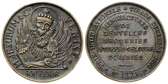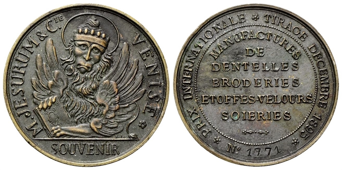 Dr. M. JESURUM & C.IE VENISE. Leone di S. Marco in maestà; sulla linea di esergo, S J; in esergo, SOUVENIR. Rv. PRIX INTERNATIONALE TIRAGE DECEMBER 1896 / N. 1771. MANIFACTURES / DE DENTELLES / BRODERIES / ETOFFES VELOURS / SOIERES. Iscrizione disposta su sei righe.