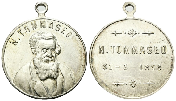 Dr. Busto di N. Tommaseo di scorcio verso d.; sotto, NICCOLÒ TOMMASEO / N. SEBENICO 1802 M. FIRENZE 1874. Rv. N TOMMASEO / 31-5-1896