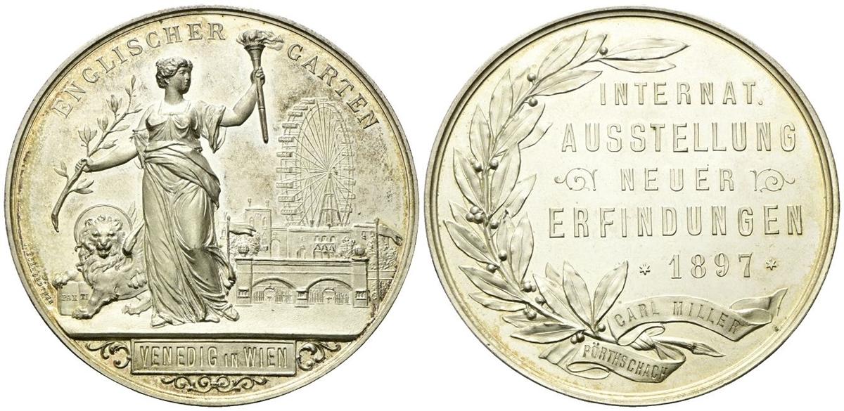 Dr. ENGLISCHER GARTEN. Figura muliebre regge una fiaccola nella s. e un ramo d’alloro nella d.; a s., leone di San Marco nimbato; a d., attrazioni del Prater; sullo sfondo, la Riesenra; a s., J. SCHWERDTNER; in esergo, entro un cartiglio munito di orname Rv. INTERNAT / AUSSTELLUNG / NEUER / ERFINDUNGEN / 1897; a s., ramo di alloro con nastro inscritto: CARL MILLER / PÜRYSCHACH