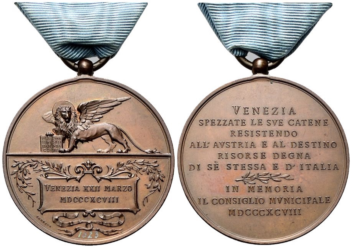 Dr. Leone di San Marco andante verso s., con libro aperto; in esergo,VENEZIA XXII MARZO / MDCCCXLVIII entro cartiglio; a s., JOHNSON. Rv. VENEZIA / SPEZZATE LE SVE CATENE / RESISTENDO / ALL’AVSTRIA E AL DESTINO / RISORSE DEGNA / DI SÉ STESSA E D’ITALIA / (ramoscello d’alloro) / IN MEMORIA / IL CONSIGLIO MVNICIPALE / MDCCCXCVIII.