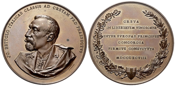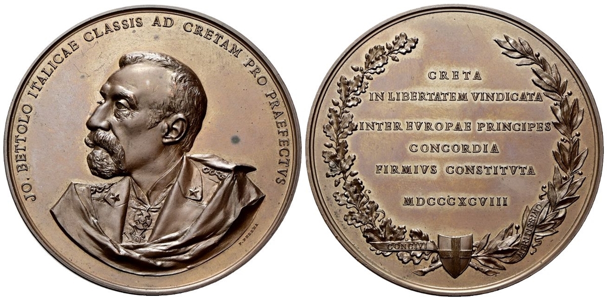 Dr. JO BETTOLO ITALICAE CLASSIS AD CRETAM PRO PRAEFECTVS. Busto, di scorcio verso s.; sotto, P FERREA. Rv. CRETA / IN LIBERTATEM VINDICATA / INTER EVROPAE PRINCIPES / CONCORDIA / FIRMIVS CONTISTVTA MDCCCXCVIII. Iscrizione disposta su sei righe tra due rami di alloro e quercia.