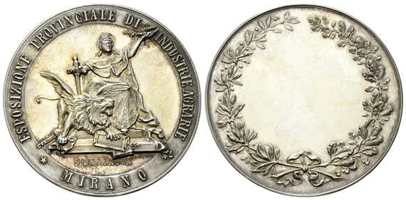 Dr. ESPOSIZIONE PROVINCIALE DI - INDUSTRIE AGRARIE / MIRANO. Venezia seduta in trono, indossa corno dogale e manto d’ermellino, regge corna di alloro e poggia la mano s. su spaga; accanto, leone di San Marco; in esergo, MDCCCXCIX - SANTI. Rv. Campo vuoto entro corona d’alloro legata in basso da nastro.