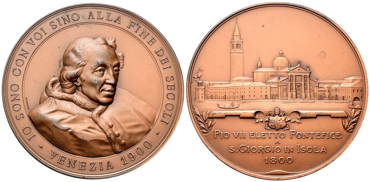 del monastero annesso; davanti, le acque solcate da gondole; in esergo, PIO VII ELETTO PONTEFICE / A / SGIORGIO IN ISOLA / 1800.