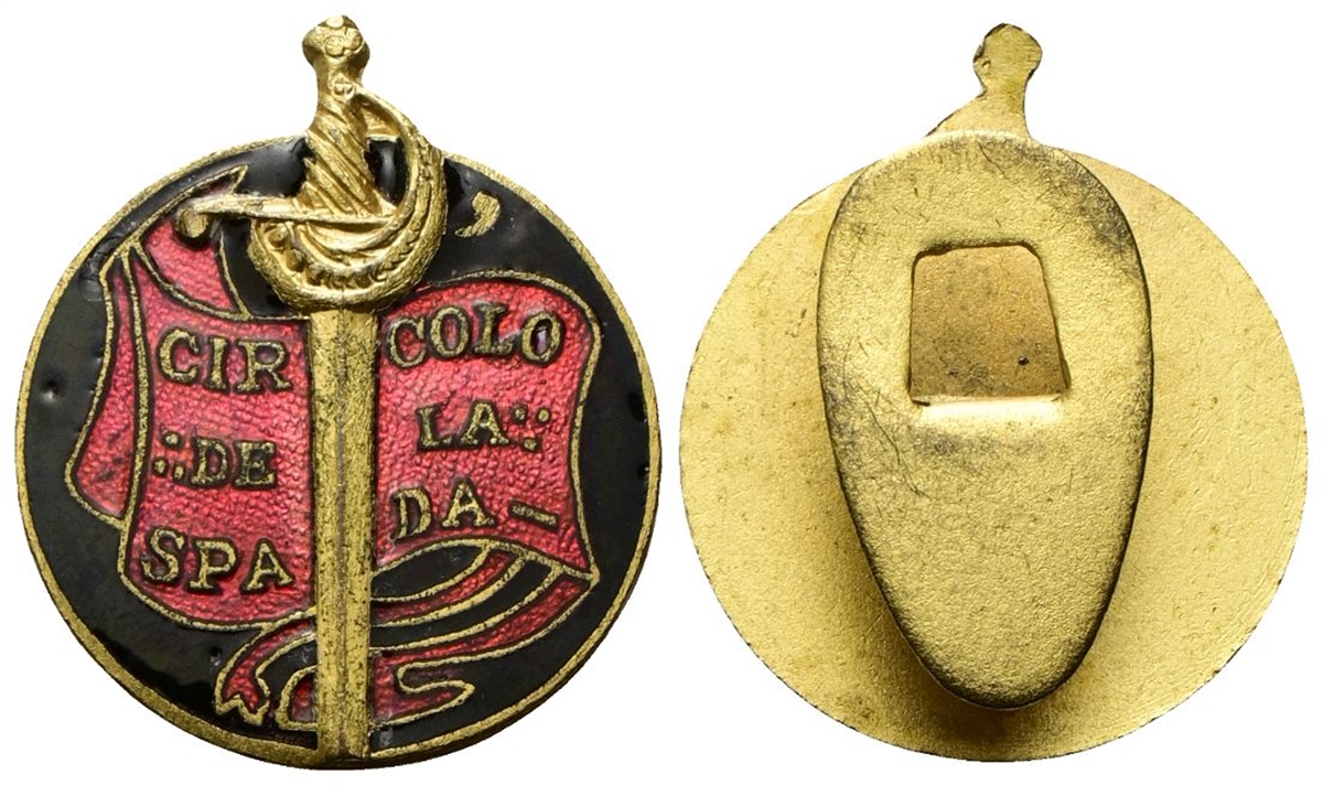 Dr. Spada la cui elsa sporge dal contorno circolare del distintivo; sullo sfondo nero, gonfalone colorato nel tipico rosso veneziano, su cui campeggiano le parole: CIRCOLO DE LA / SPADA. Rv. Piedino portativo da infilare in un’asola della giacca.