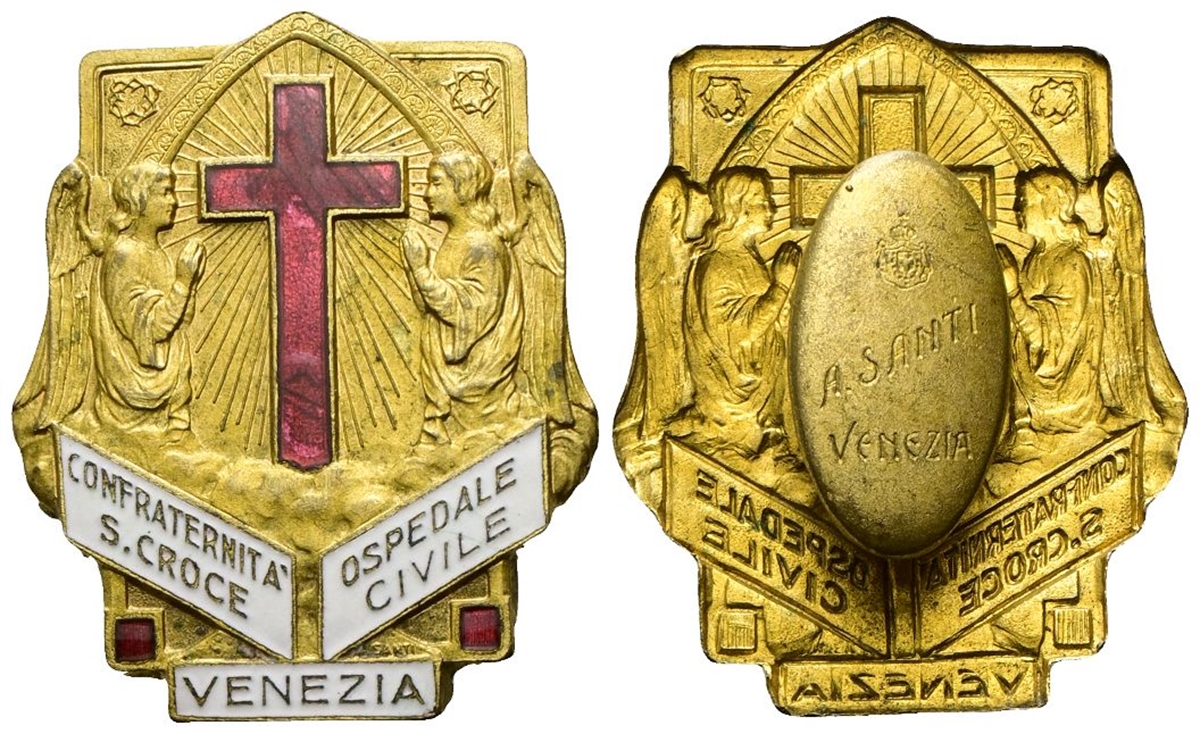 Dr. Croce in smalto rosso entro arco gotico; ai lati, un angelo in preghiera; sotto, CONFRATERNITA / S. CROCE - OSPEDALE CIVILE; sotto, VENEZIA. Rv. Piedino portativo da infilare in un’asola della giacca inscritto A SANTI / VENEZIA.