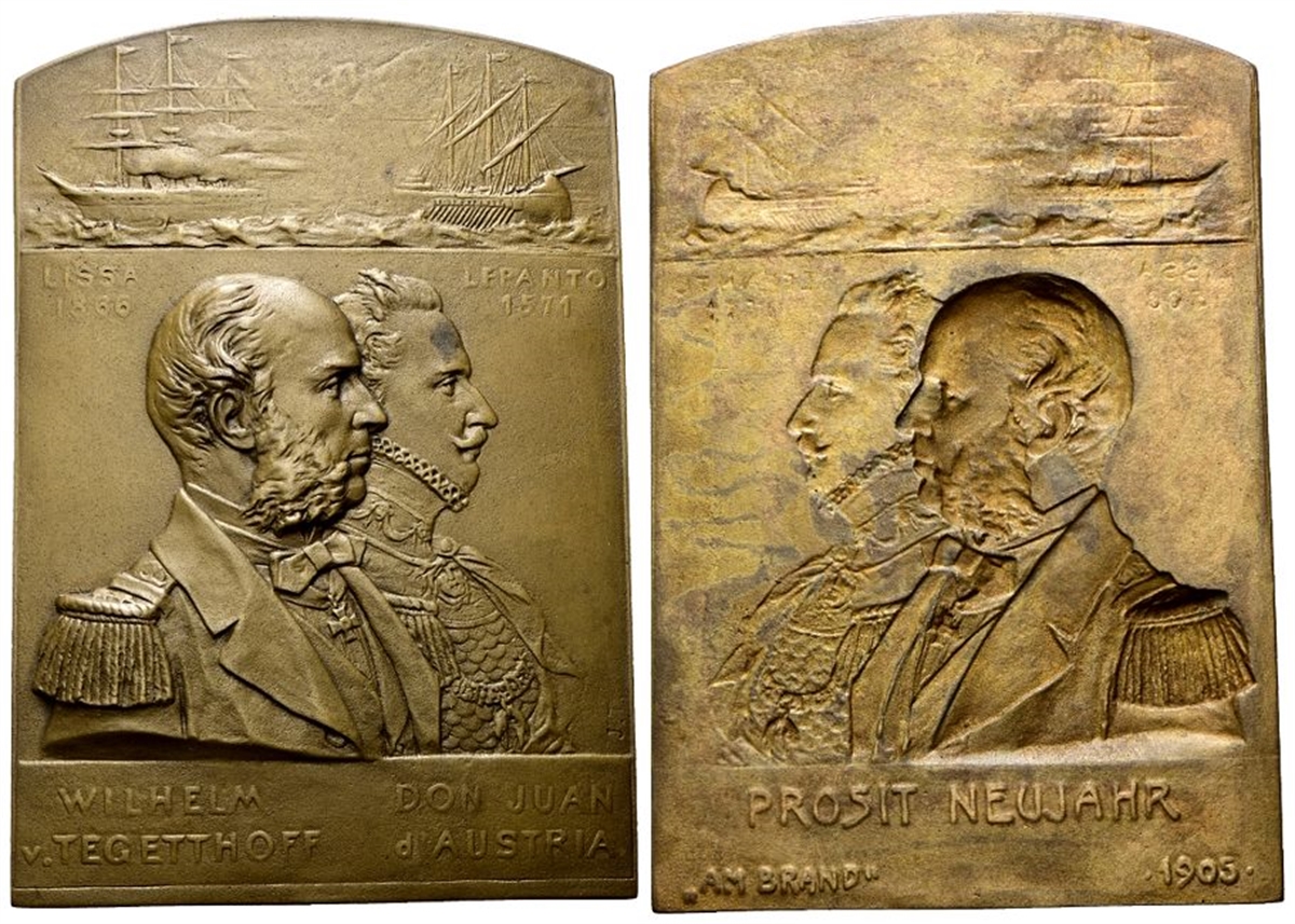 Dr. Busti affiancati dell’ammiraglio Wilhelm Von Tegetthoff e don Giovanni d’Austria a d.; sopra, le loro navi e le date delle loro vittorie navali; sotto, WILHELM / V TEGETTHOFF - DON JUAN / D’AUSTRIA. Rv. Stesso soggeto incuso; sotto, PROSIT NEWAHR / AM BRAND - 1905.