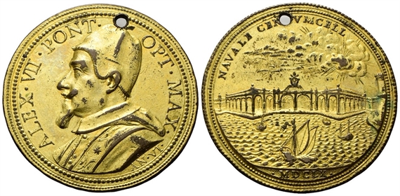 Dr. ALEX VII PONT - OPT MAX. Busto a s., con camauro, mozzetta e stola; sul taglio del braccio, G M; sotto, AN VI. Rv. NAVALE CENTVMCELL. Il nuovo arsenale di Civitavecchia sormontato dallo stemma papale con le imbarcazioni; in esergo, MDCLX.