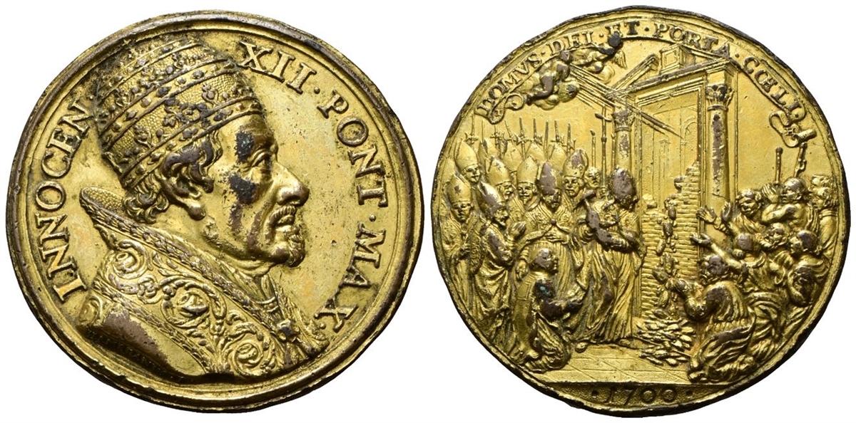Dr. INNOCEN - XII PONT MAX. Busto a d. con triregno e piviale decorato; sulla troncatura della spalla, HAMERANVS F. Rv. DOMVS DEI ET PORTA COELI (iscrizione su cartiglio). Il Pontefice in atto di aprire la Porta Santa; a s., cardinali e guardie svizzere; a d., pellegrini in ginocchio; in esergo, 1700 (incuso).