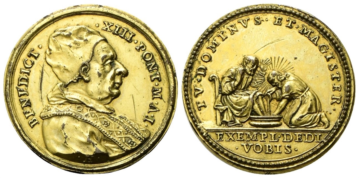 Dr. BENEDICT - XIII PONT M A I. Busto a d. con camauro, mozzetta e stola; sotto la troncatura della spalla, H. Rv. TV DOMINVS ET MAGISTER. Lavanda dei piedi; in esergo, EXEMPL DEDI / VOBIS.