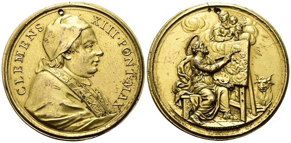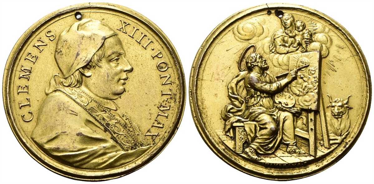 Dr. CLEMENS - XIII PONT MAX. Busto a d. con camauro, mozzetta e stola ornata con croce. Rv. S. Luca pittore, ritrae la beata Vergine radiata col Bambino tra le nubi; sdraiato a d. dietro la tela, il bue; sotto, HAMERANO F.