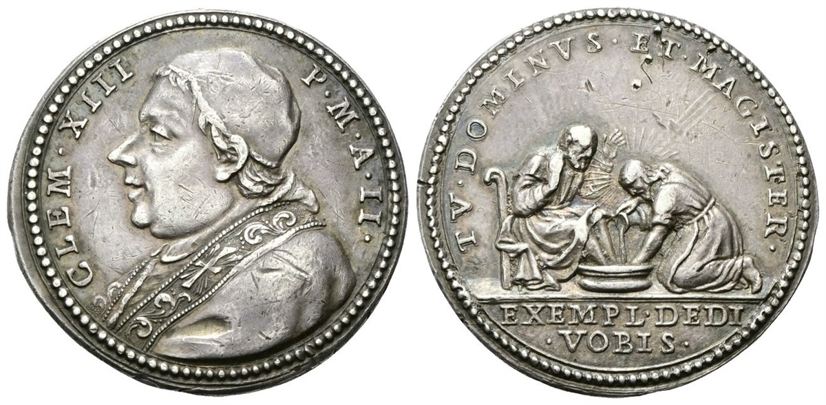 Dr. CLEM XIII - P M A II. Busto a s. con camauro, mozzetta e stola ornata con croce; nel taglio del busto, O H. Rv. TV DOMINVS ET MAGISTER. Gesù lava i piedi a S.Pietro; in esergo, EXEMPL DEDI / VOBIS.