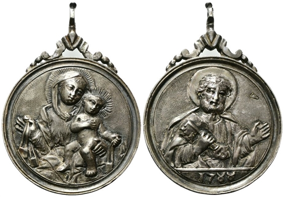 Sec. XVIII. Medaglia religiosa 1788 con la Vergine Maria e San Pietro con appiccagnolo.