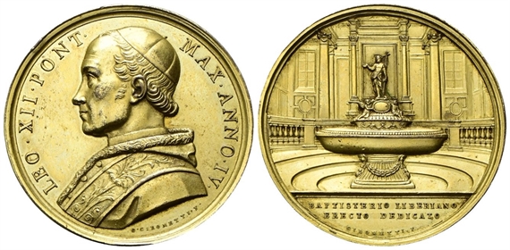 Dr. LEO XII PONT - MAX ANNO IV. Busto a s. con berretto, mozzetta e stola; sotto la tronctura del braccio, G GIROMETTI F. Rv. Fonte battesimale in Santa Maria Maggiore; in esergo, BAPTISTERIO LIBERIANO / ERECTO DEDICATO.