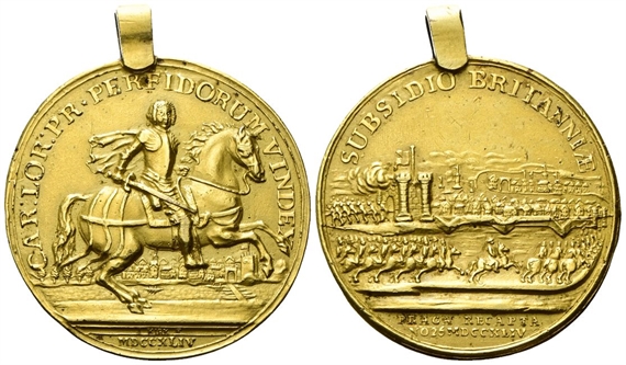 Dr. CAR LOR PR PERIDORUM VINDEX. Il principe di Lorena a cavallo verso d.; sullo sfondo, veduta di Praga; in esergo, MDCCCXLIV. Rv. SUBSIDIO BRITANNIAE. Esercito austriaco entra a Praga; in esergo, PRAGA RECAPTA / NO 26 MDCCXLIV.