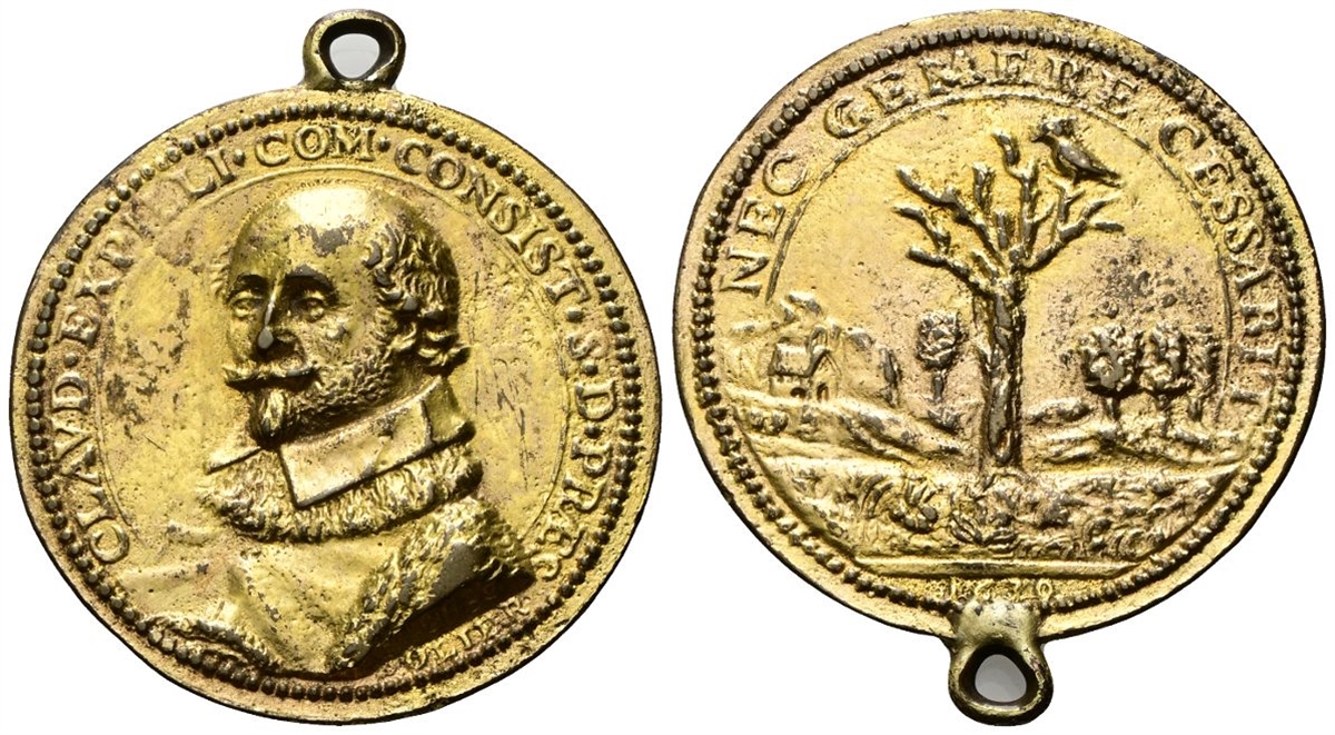 Dr. CLAVD EXPILLI COM CONSIST S D PRÆS. Busto di scorcio verso s.; sotto, OLIER. Rv. NEC GEMERE CESSABIT. Una tortora su un albero morto in un paesaggio boschivo con una piccola cappella; in esergo, 1630.