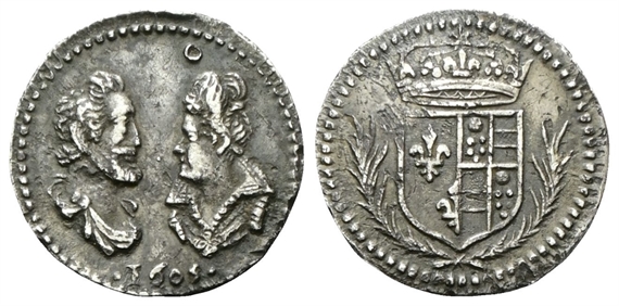 Dr. Busti affrontati del re e della regina di Francia; sotto, 1605. Rv. Scudo coronato di Borbone, tra due rami di palma.